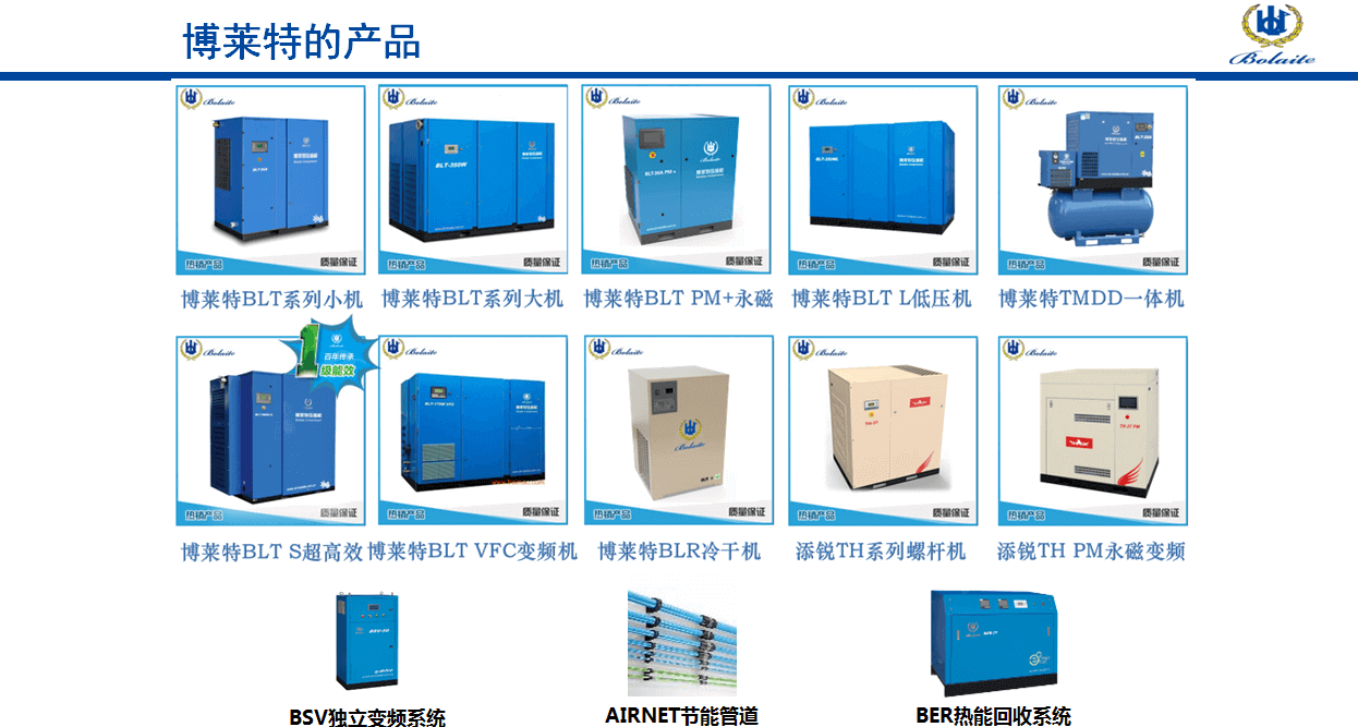 2、博莱特使用阿特拉斯·科普柯主机,技术先进,转子密封性好,压缩过程内泄小,效率高;