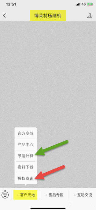 【微信公众号】搜索关注“博莱特压缩机” – “客户天地” – “授权查询” – “请输入授权编号” – “查询” – 结果显示(操作页面“示例”,如下)。