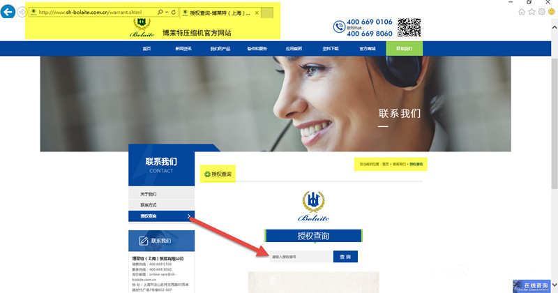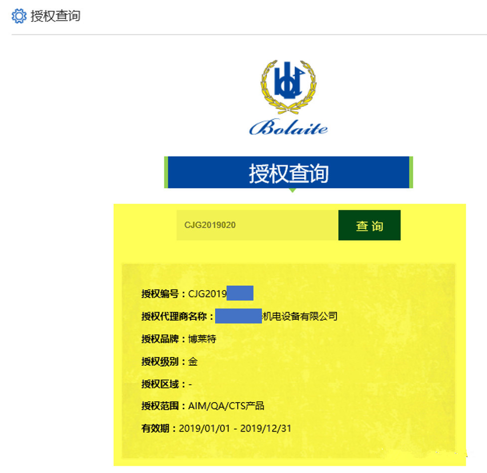【官方网站】点击登陆 www.sh-bolaite.com.cn – “首页” – “联系我们” – “授权查询” – “请输入授权编号” – “查询” – 结果显示(操作页面“示例”,如下)。