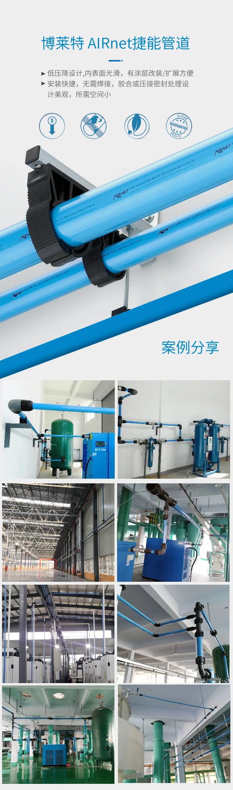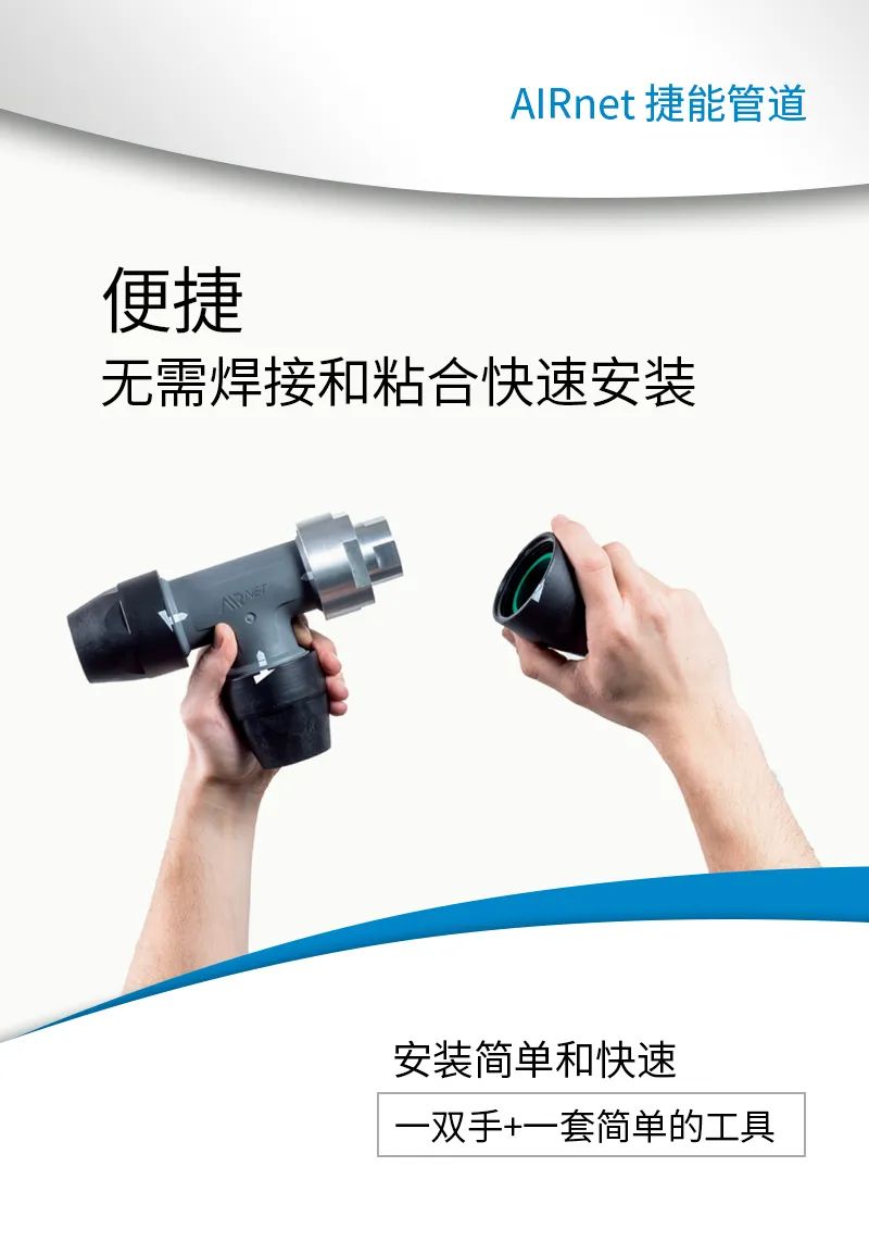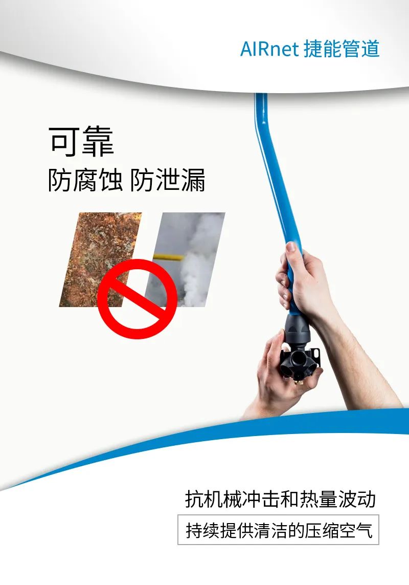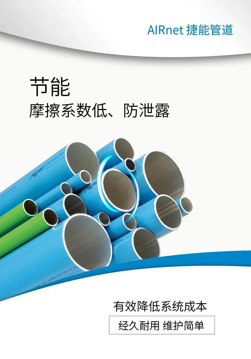 AIRnet 捷能管道是高效的空气或气体管网解决方案,AIRnet捷能管道具有防泄漏和防腐蚀性能,安装快速、简单,确保您的空压机正常运行。